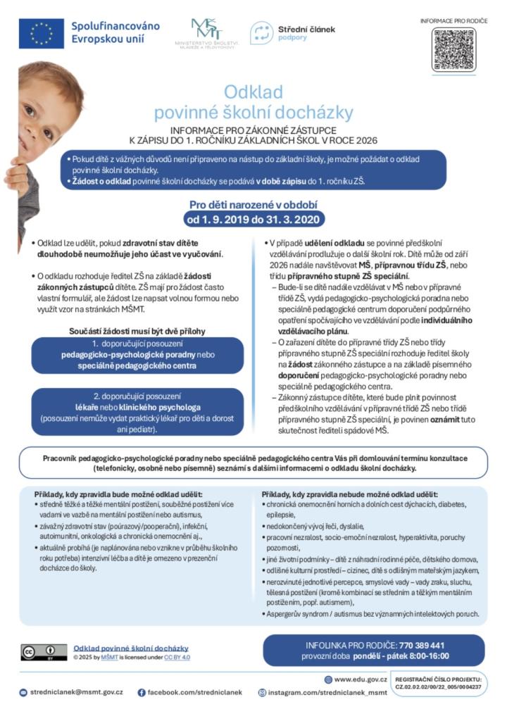 Přikládáme aktuální informace k postupu při podání žádosti o odklad povinné školní docházky i k samotnému zápisu do 1. třídy.