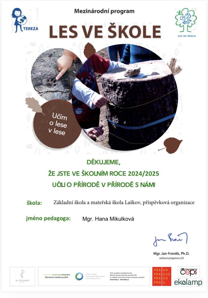 V týdnu od 2. do 6. června 2025 se žáci 1.–5. ročníku ZŠ a MŠ Laškov zúčastnili školy v přírodě, během které se aktivně zapojili do vzdělávacího programu Les ve škole.